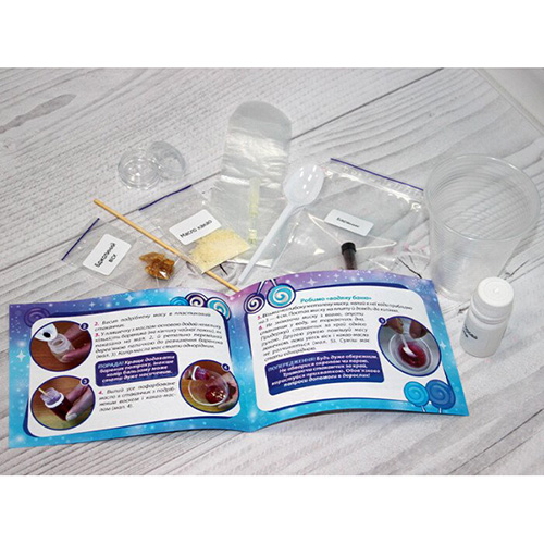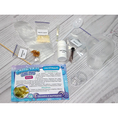 масло-основа, какао-масло, пчелиный воск, эфирное масло, баночка для бальзама, пластиковый стаканчик, пластиковая ложка, деревянная палочка, краситель, инструкция.