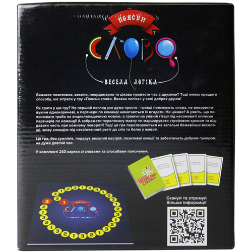 Для создания игры украинский производитель использовал экологически чистое, безопасное для детского здоровья сырье, красители, которые не содержат токсичных веществ и не вызывают аллергию. Игровой набор включает в себя 243 специальные карточки со способами объяснения, красочное поле, 6 игральных фишек, а также правила для начинающих. Подобные развлечения активизируют в приятной для ребенка, игровой форме развитие памяти, логического мышления, внимательности и находчивости.