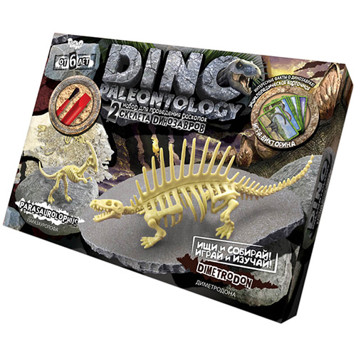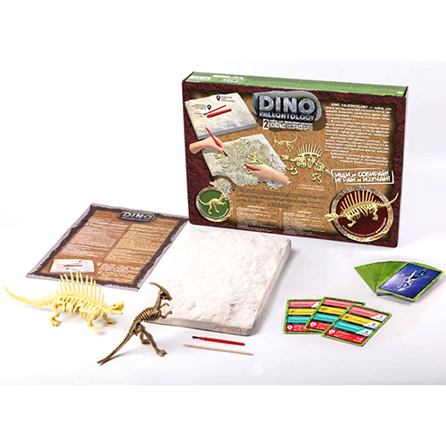 DINO PALEONTOLOGY — набор для юных исследователей-палеонтологов, решивших посвятить свободное время поискам и изучению останков вымерших гигантов нашей планеты! В этой коробке находится пласт окаменелой земной породы с настоящими ми скелетов динозавров, а так же археологический набор инструментов, необходимых для проведения раскопок. Красочная инструкция, поможет правильно подойти к процессу раскопок и в увлекательной игровой форме поведает вам о некоторых исторических фактах, найденных динозавров! Собранная и цельная фигура станут прекрасным трофеем и коллекционной игрушкой Вашего палеонтолога!