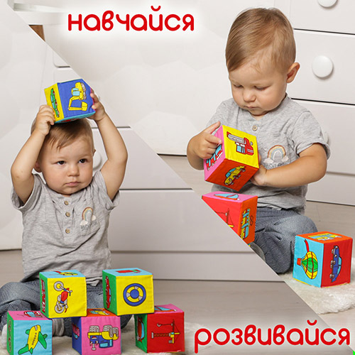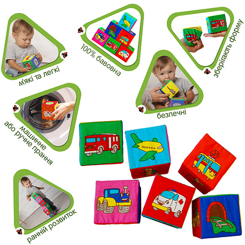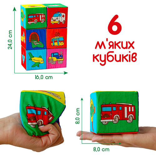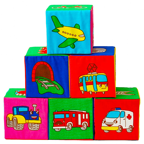 Мягкие кубики с яркими тематическими рисунками – идеальный вариант для увлекательных и полезных игр. Кубики можно бросать, мять, строить из них фигуры. В процессе игры малыш знакомится с разными видами транспорта. Вес и размер кубиков удобны для детских ручек. Они легкие, приятные на ощупь, сшиты из натуральных слюновпитывающих тканей, внутри – гипоаллергенный наполнитель. Не накапливают пыль, сохраняют форму после стирки.