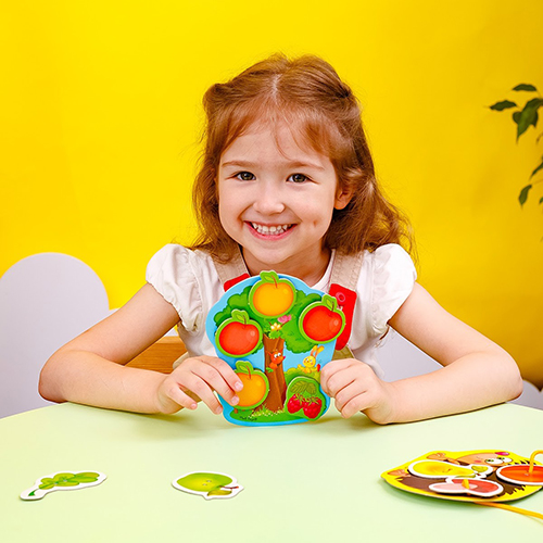 Учимся ориентироваться в пространстве и считать до 5 вместе с забавным ежиком! Крепите картонные фигурки с яблочками, грибочками и другими лесными вкусняшками к карточке-основе. Сколько яблочек появилось на дереве? Посчитайте. Остальные плоды пришнуруйте к основе-ежику. У него сегодня хороший урожай! В процессе игры тренируйте логическое мышление, память, внимание и мелкую моторику.