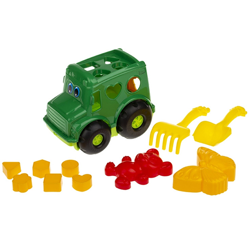 За игрушками легко ухаживать, после прогулки игрушки достаточно промыть теплой водой с нейтральным моющим средством. В комплекте: автобус с вкладышами, лопатка, грабельки и две большие пасочки.
