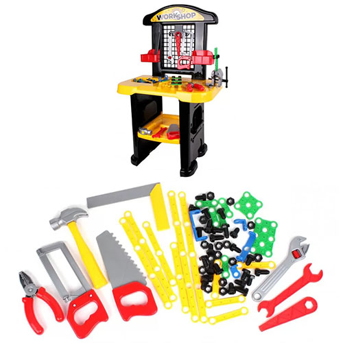 Настоящая игрушечная «Мастерская» для маленьких папиных помощников. Большой, удобный и устойчивый стол со столешницей из отверстиями и резьбой для винтов, набор инструментов, планки, гайки и болты - все, что нужно для юных мастеров. Ребенок познакомится с основными инструментами и овладеет навыками работы с ними. Такие игры развивают мелкую моторику рук, фантазию, воображение, исполнительность и аккуратность. Игрушечная «Мастерская» непременно станет любимой игрушкой для ваших детей, позволит мальчикам вместе с папой проводить время интересно и полезно.