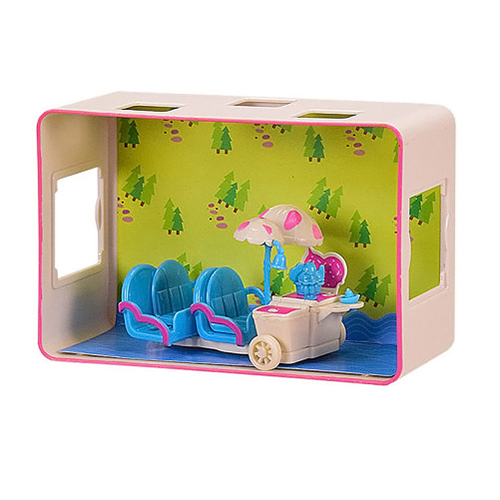 Игровой набор на планшетке. В комплекте две маленькие фигурки пупсов в оригинальных шапочках и два маленьких питомца. Так же в наборе транспорт, мороженое. Размер пупса 4 см.