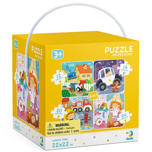 Пазл 4 в 1 "Профессии" украинской ТМ Додо в подарочной объемной коробке-кубе с ручкой. В комплекте четыре отдельных пазла из 12, 16, 20 и 24 элементов. Размер каждой картинки в собранном виде 22х22 см. Размеры элементов от 7,3х5,5 см до 5,5х3,6 см. Такой набор станет отличным подарком для маленького любителя пазлов.