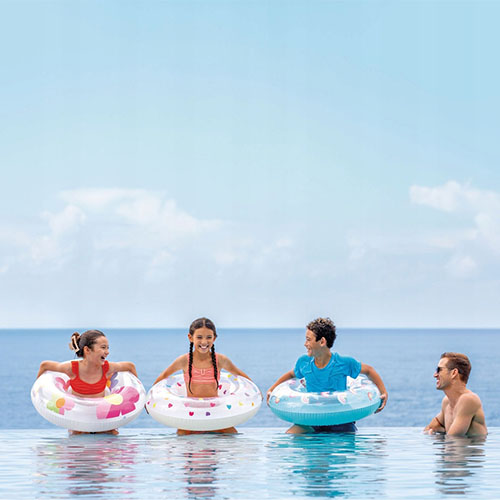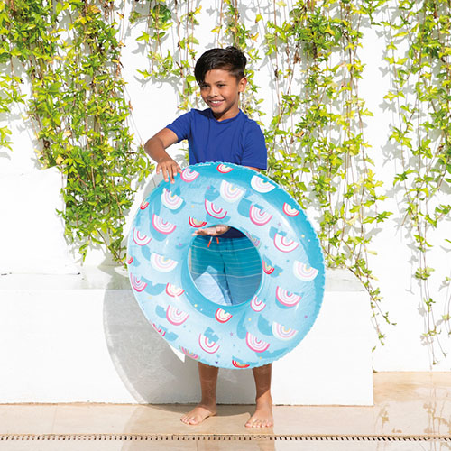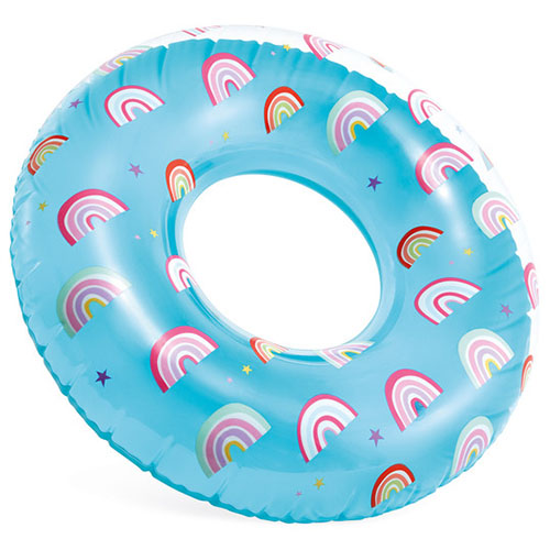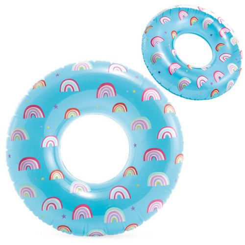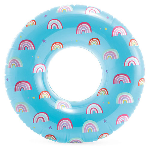 Надувной круг Intex — стильный аксессуар для комфортного отдыха на воде. Прозрачная основа украшена радугами, создающими свежий, летний образ и ощущение курортной атмосферы.