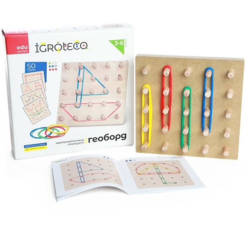 Геоборд (geoboard) - это многофункциональная геометрическая доска для конструирования плоских изображений, деревянная доска з резиночками. Это уникальная развивающая еко игрушка для учебы и отдыха одновременно. Также она способствует развитию: - пространственного и ассоциативного мышления, - внимания, памяти - мелкой моторики, ведь натягивания резинок требует точности движений, а также это своеобразный массаж пальчиков и рук ребенка - базовых знаний по геометрии - идеально подходит для самостоятельной игры и расслабления ребенка - способствует развитию фантазии, творческого видения - игрушка развивает когнитивные способности ребенка, пространственное и ассоциативное мышление.