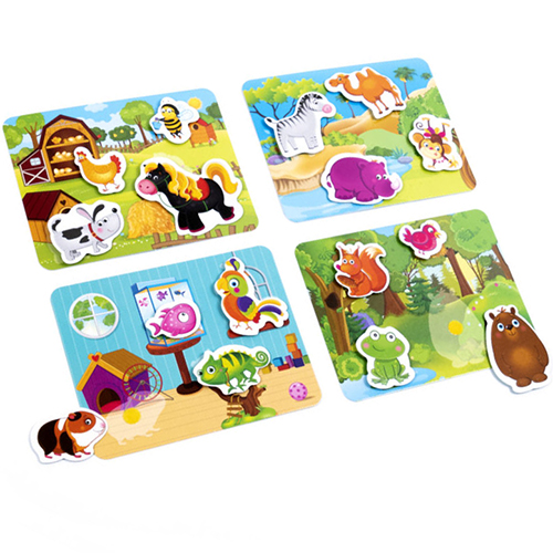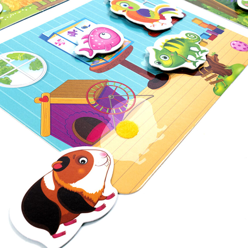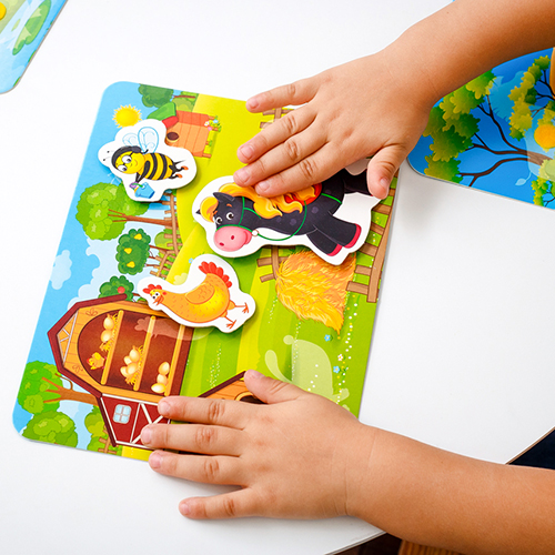 Изучайте животных и их среду обитания в интересной игровой форме! Крепите фигурки с помощью липучек к игровым полям в обозначенные места. Например, берем карточку с фермерским пейзажем. Кто здесь живет? Курочка, лошадка, пчелка. Ищем картонные фигурки с этими животными и крепим к карточке с помощью липучек. Готово! В процессе игры малыш потренирует логическое мышление, память, речь и мелкую моторику.