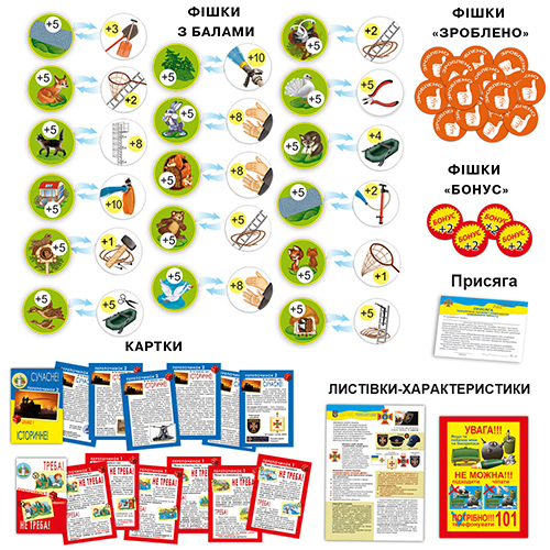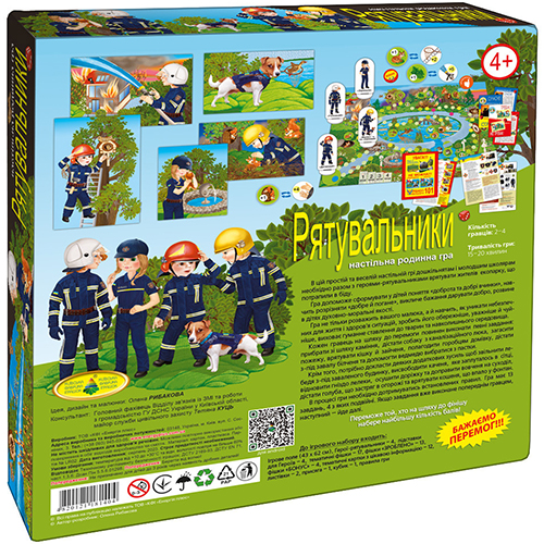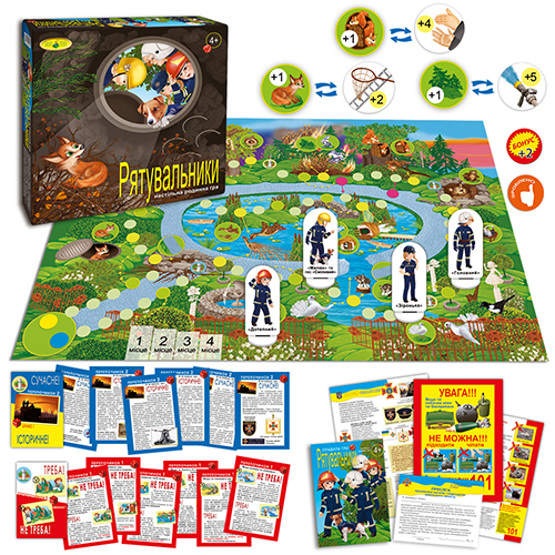• Комплектация: игровое поле (43 х 62 см), герои-спасатели – 4 шт., подставки для героев – 4 шт., тематические фишки – 17 шт. (фишки «СДЕЛАНО» – 13, фишки «БОНУС» – 4), тематические карточки с интересной информацией – 12 шт., листовки – 2 шт., присяга, кубик, правила игры.
