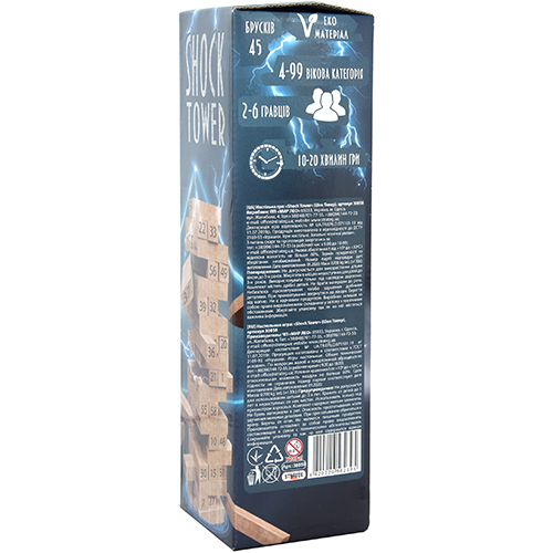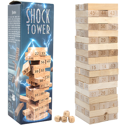 «Shock Tower» - настольная игра, в которой вы шаг за шагом будете возводить небоскреб из деревянных брусков как можно выше. Игроки собирают башню, после чего по очереди бросают кубики и выбирают бруски с цифрой, которая выпала на кубике. Если не вы разрушили башню - вы победили.
