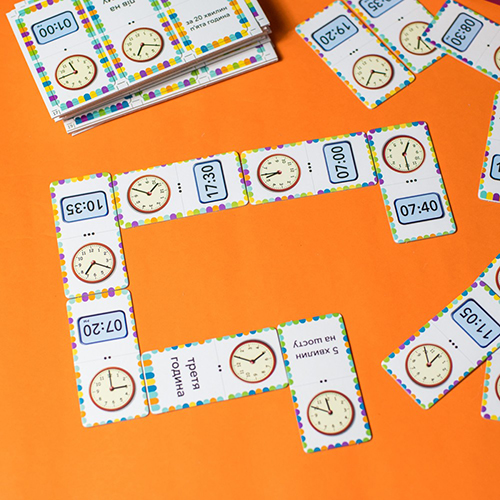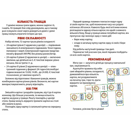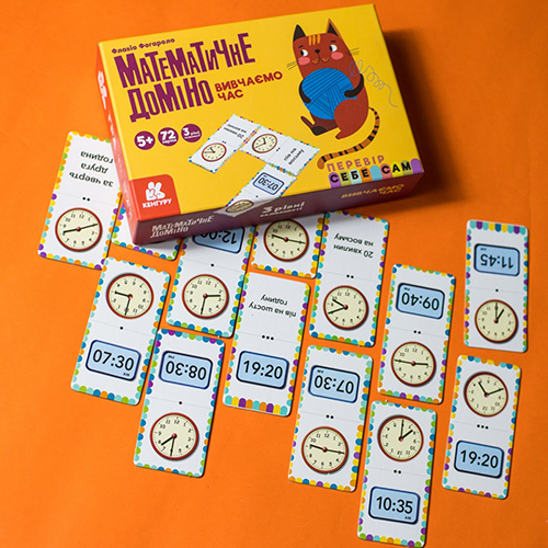 Эта игра из серии «Математическое домино» поможет детям легко научиться определять время по обычным и электронным часам и позволит проводить досуг в кругу семьи или друзей не только с удовольствием, но и с пользой!