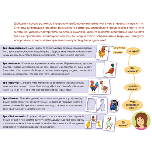 Игры и набор карт «Во дворе» содержат упражнения, позволяющие заниматься с младенцем в любое время и в любом месте, познакомят ребенка с птичками - жителями двора, и с их птенцами. Игры направлены на развитие сенсорного восприятия, развитие речи и познания окружающего мира. Сочиняйте новые развлечения с птичками соответственно преимуществам и темпераменту вашего малыша, общайтесь с ребенком эффективно и с любовью!