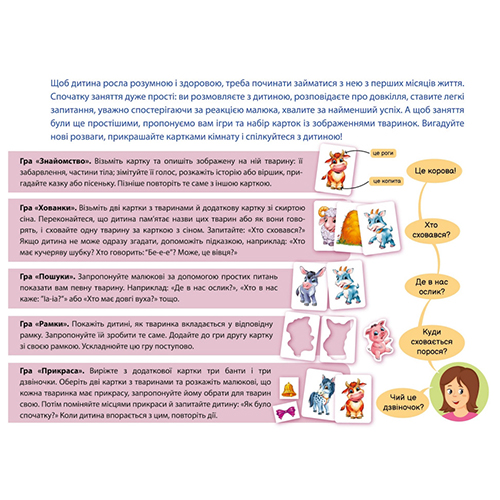 Потребности младенца в общении и развитии должны как можно полнее удовлетворяться, так что играйте с ним с первых месяцев. Процессы игры и развития у ребенка неразрывно связаны. Пять игр и набор карт «На ферме» знакомят с животными - жителями фермы, развивают зрение, слух, мелкую моторику, помогают совершать первые осознанные действия. Описание каждого упражнения детализировано и изложено максимально понятным способом. Во время игры внимательно наблюдайте за реакцией малыша, хвалите за малейший успех, общайтесь с ребенком!