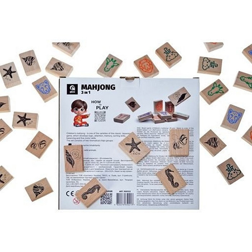Детский маджонг - это одна из разновидностей классической японской игры, которая развивает логику, воображение, память, навыки сортировки, балансировки и мелкую моторику рук. Набор состоит из двух комплектов фишек разной тематики: черные - морские обитатели, цветные - дикие животные.
