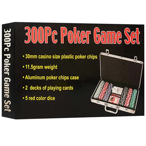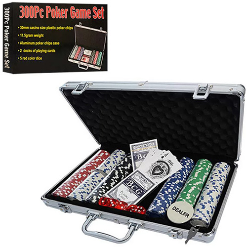 Комплектация: 300 фишек без номинала (d – 4 см, толщина – 3 мм, вес – 11, 5 граммов, цвета – белый, красный, синий, темно-синий, зеленый) Фишка дилера (белый цвет) 2 колоды игральных карт 5 игральных костей (кубиков) Форма кейса – прямоугольная.