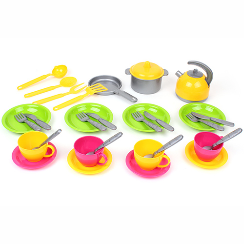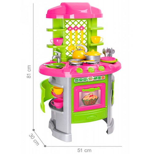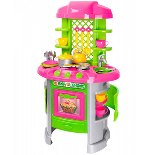 Набор игрушечной посуды позволит девочке почувствовать себя хозяйкой у плиты с тремя конфорками, мойкой с краном, полочками и маленькими шкафчиками для посуды.