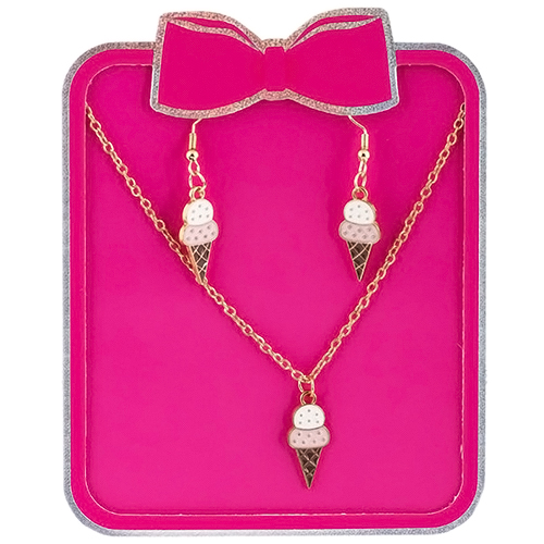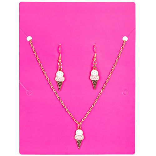 - набор включает ожерелье из золотистого металла и серьги; кулон и серьги выполнены в форме мороженого, что придает изделиям оригинальный и веселый вид;