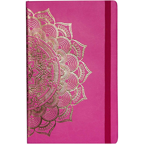 Записная книжка эко с кремовыми листами в точку Мандала малинового цвета поражает золотым тиснением, создавая изысканный аксессуар для записей. Обложка, изготовленная из кожзаменителя, который производится из переработанной одежды, придает ему приятную на ощупь текстуру и отличается экологичностью.