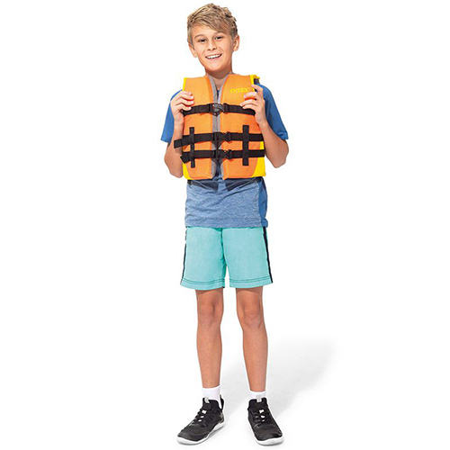 Спасательный жилет для плавания с наполнением из вспененного полиэтилена не требует надувания. Материал очень легкий и отлично держит на воде. Верхняя часть выполнена из долговечного и износостойкого нейлона, приятного на ощупь.