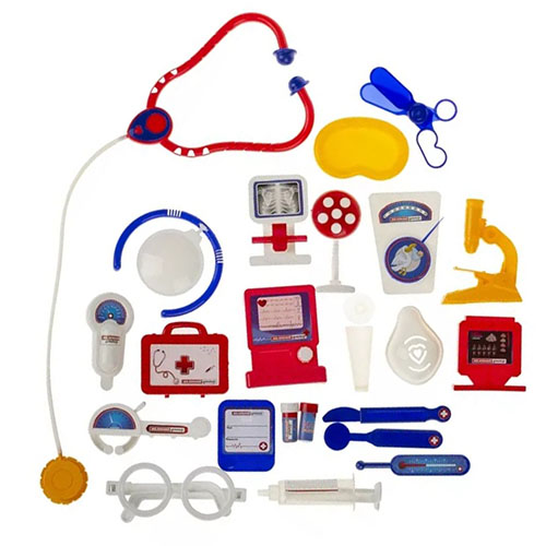 - Вот таким мечтателям и пригодится набор "Маленький доктор", - в нем есть все необходимое для врача: очки, рентген-аппарат, компьютер, измеритель пульса, пилюли (2 дет.), шприц, стакан, ножницы, градусник, ложечка, скальпель, рефлектор, бейджик, фонендоскоп, ванночка, микроскоп, весы напольные, тонометр, лампа, чемодан, телевизор, маска.