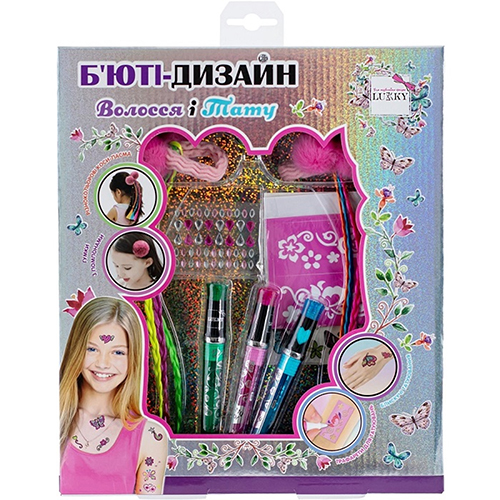 Набор для бьюти-дизайна Lukky Волосы и тату - это замечательный подарок для ребенка, который увлекается бьюти-дизайном. Набор сделан из качественного гипоаллергенного материала и развивает воображение, внимание, творческие способности, фантазию и мелкую моторику. В наборе: разноцветные косы-пасма; резинки с помпонами; блестящие татуировки; трафареты; ручки для татуировок.