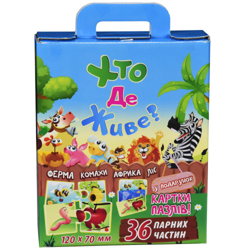 Не только развлечение, но и обучение – мини-пазлы «Кто где живет» (Strateg 30700) познакомят малыша с обитателями фермы и леса, животными Африки и насекомыми. Кроме этого покажут места, где они обитают. Всего в наборе 36 мини-пазлов, состоящих из двух частей – необходимо подобрать каждому животному его жилище. Чтобы помочь малышу в комплекте есть карточки с готовыми картинками. Процесс сборки рисунка из отдельных фрагментов изображения поможет развить не только логику, воображение, память, но и физические навыки – такие как координацию и моторику пальчиков. Игры с пазлами способствуют развитию личности и характера малыша – усидчивости, аккуратности и настойчивости. Высококачественная износоустойчивая полиграфия сохранит изображения даже после многократной сборки.
