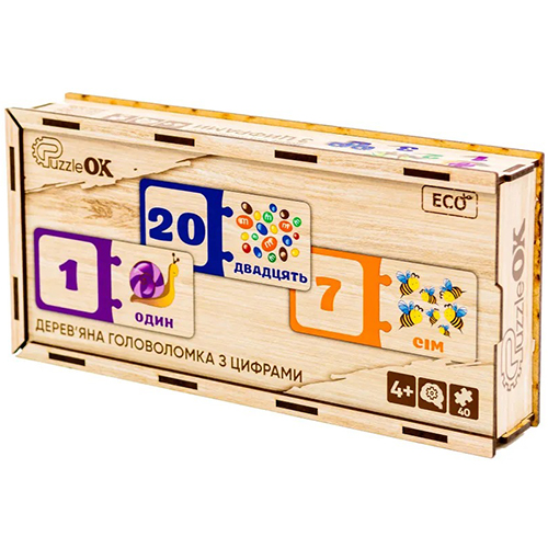Деревянная развивающая игрушка-головоломка, которая помогает быстро выучить цифры детям от 4 лет. В комплект входит деревянная коробка с защелкивающейся крышкой и 20 пластин с цифрами. Изготовлена из экологической плотной прессованной древесноволокнистой плиты без каких-либо вредных примесей. Изображения цифр нанесены безопасными красками и устойчивы к истиранию.